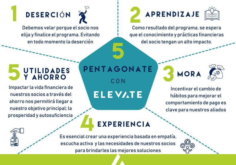 El pentágono de Elevate fue creado para representar los 5 indicadores más importantes, estos son los cuadrantes con más peso en la operación de la empresa y en los resultados como aliados.