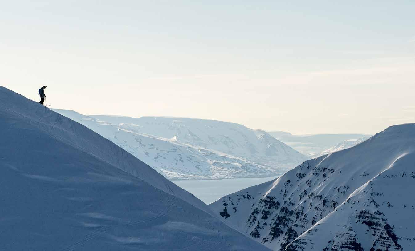 Heli-skiing on the Troll Peninsula is known not only for its beautiful rolling descents and steep couloirs leading all the way to the ocean, but also for its sunshine. The land of the midnight sun offers some of the most extended daylight hours on earth, giving intrepid skiers more time to rack up vertical. And thanks to a diversity of terrain, tackling untracked heli-ski descents on Iceland’s Arctic maritime snowpack is for the aggressive skier and the smooth cruiser alike. Beyond a shadow of a doubt, the summit-tosea panorama surrounding you while skiing will take your breath away.