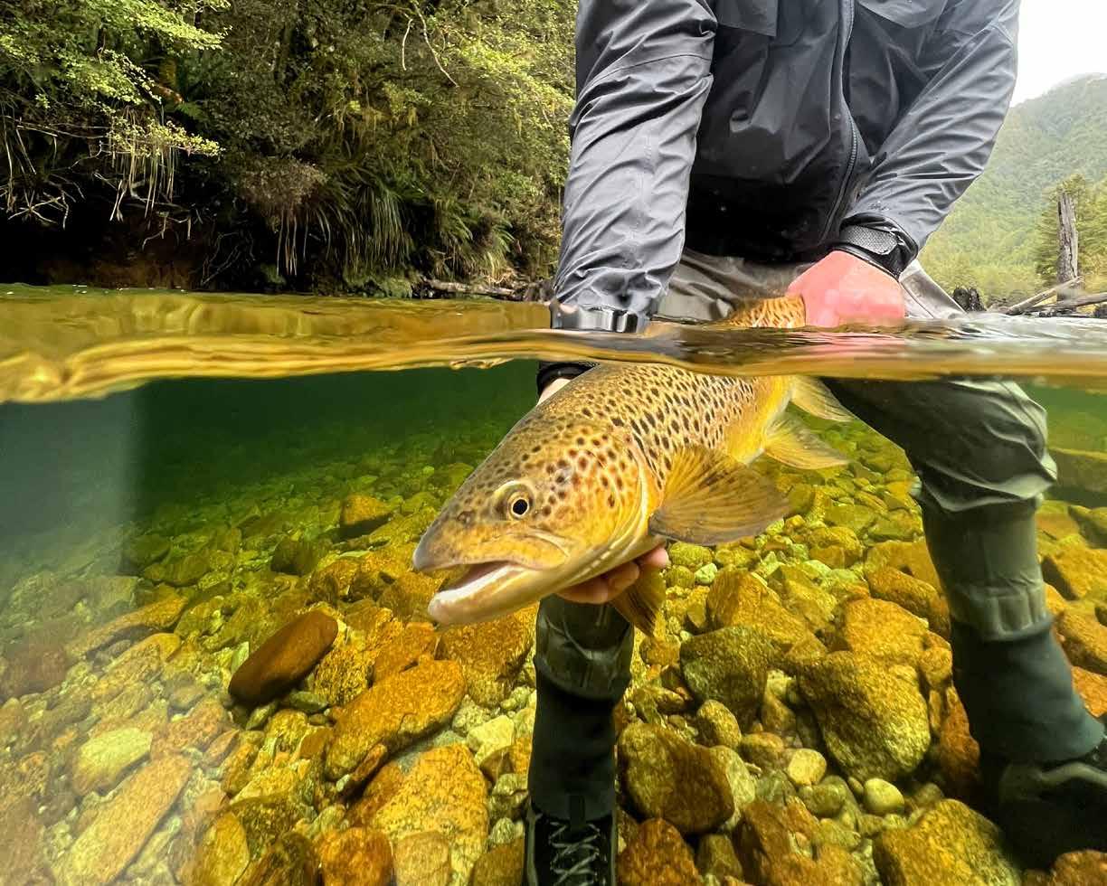 Our go-to flies are: Mayfly, Caddis Pupa, Stonefly, Midge, Coloburiscus, Cicada (Terrestrial patterns) Brown and Green Beetles, Willow grub, Blow flies, Ants, and more. We use nymphs patterns such as Pheasant tail flashbacks and tungsten-beaded Hare and Copper nymphs size 12-18, Green/Grey Caddis variations size 10-14, and dry flies like Adams, Blow flies, Humpies and emergers (CDC) imitations. Leaders are often 15-18 feet, which can be an adjustment for guests accustomed to 9-foot leaders. The brown trout in New Zealand are very line shy, so a longer leader is more practical for success.