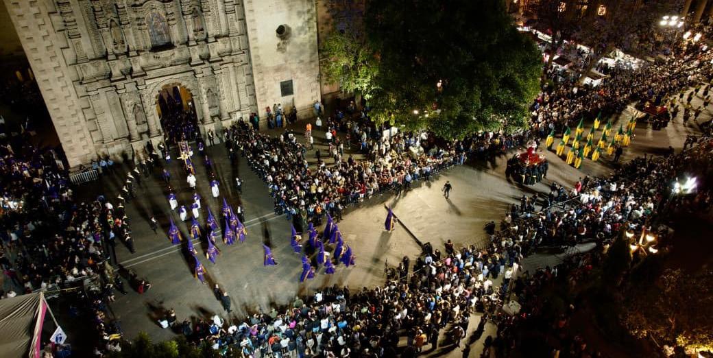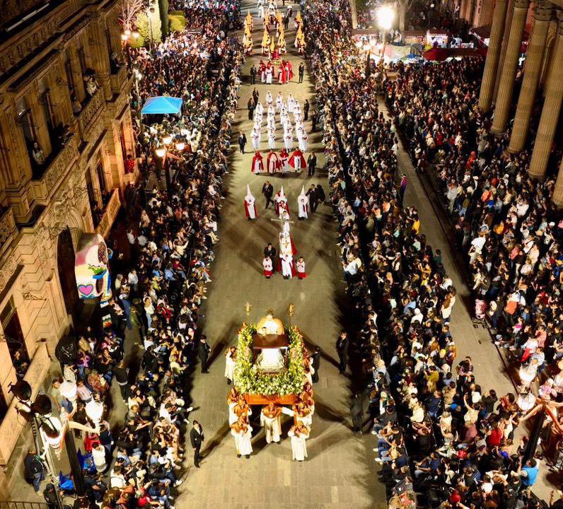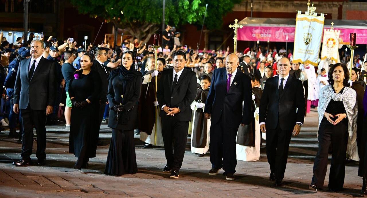 c La edición 74 de la Procesión del Silencio volvió a enlutecer la noche del Viernes Santo en el Centro Histórico de SLP capital, al congregar a miles de asistentes pese al amago de lluvia y a una gresca registrada horas antes entre integrantes de distintas cofradías en las inmediaciones del templo del Carmen. El altercado ocurrió alrededor de las 17:30 horas, cerca de la puerta barroca, por el acomodo de las imágenes que comenzarían a integrarse a la marcha, solo hubo empujones e insultos. Más tarde, a las 20:04 horas, la procesión inició con la apertura de las puertas principales del templo al llamado de la trompeta y al sonido de los golpes del banderín sobre la madera. Vestido con traje negro, corbata del mismo color y camisa blanca, el gobernador Ricardo Gallardo encabezó la columna compuesta por unas 30 cofradías, en la primera ocasión en que un titular del Poder Ejecutivo estatal participa en la traza procesional. También estuvo el alcalde Enrique Galindo. Este año se contabilizaron al menos 2 mil participantes, entre costaleros, cofrades, penitentes, damas y menores conocidos como nazarenitos. Durante el recorrido no se reportaron incidentes mayores. La alta afluencia confirmó una vez más a la Procesión del Silencio como una de las expresiones más emblemáticas de la Semana Santa potosina.