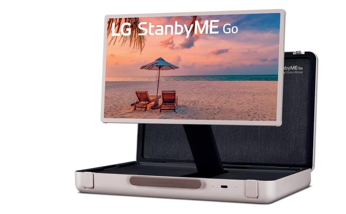 LG StandbyME Go es una TV de 27 pulgadas que se almacena en una maleta para poder llevar el entretenimiento a todos lados. La pantalla es táctil, y está sujeta con un soporte que se puede girar, inclinar e incluso rotar para ver contenido en posiciones horizontal o vertical, o en “modo mesa”.