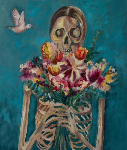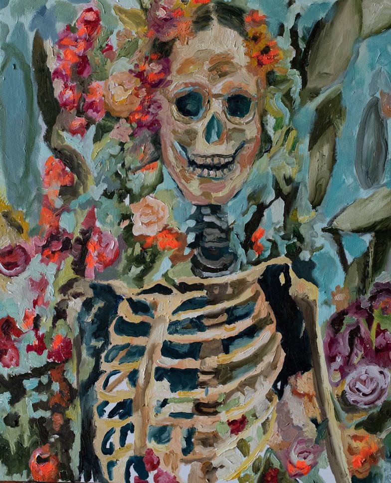 energía vital que persiste más allá del cuerpo. La artista transforma el símbolo de la calavera en una metáfora de plenitud: un testimonio de lo vivido, de los sueños cumplidos y de las emociones que perduran “hasta los huesos”. Su obra, más que representar la muerte, celebra la vida y la posibilidad de inmortalizarla en el arte.