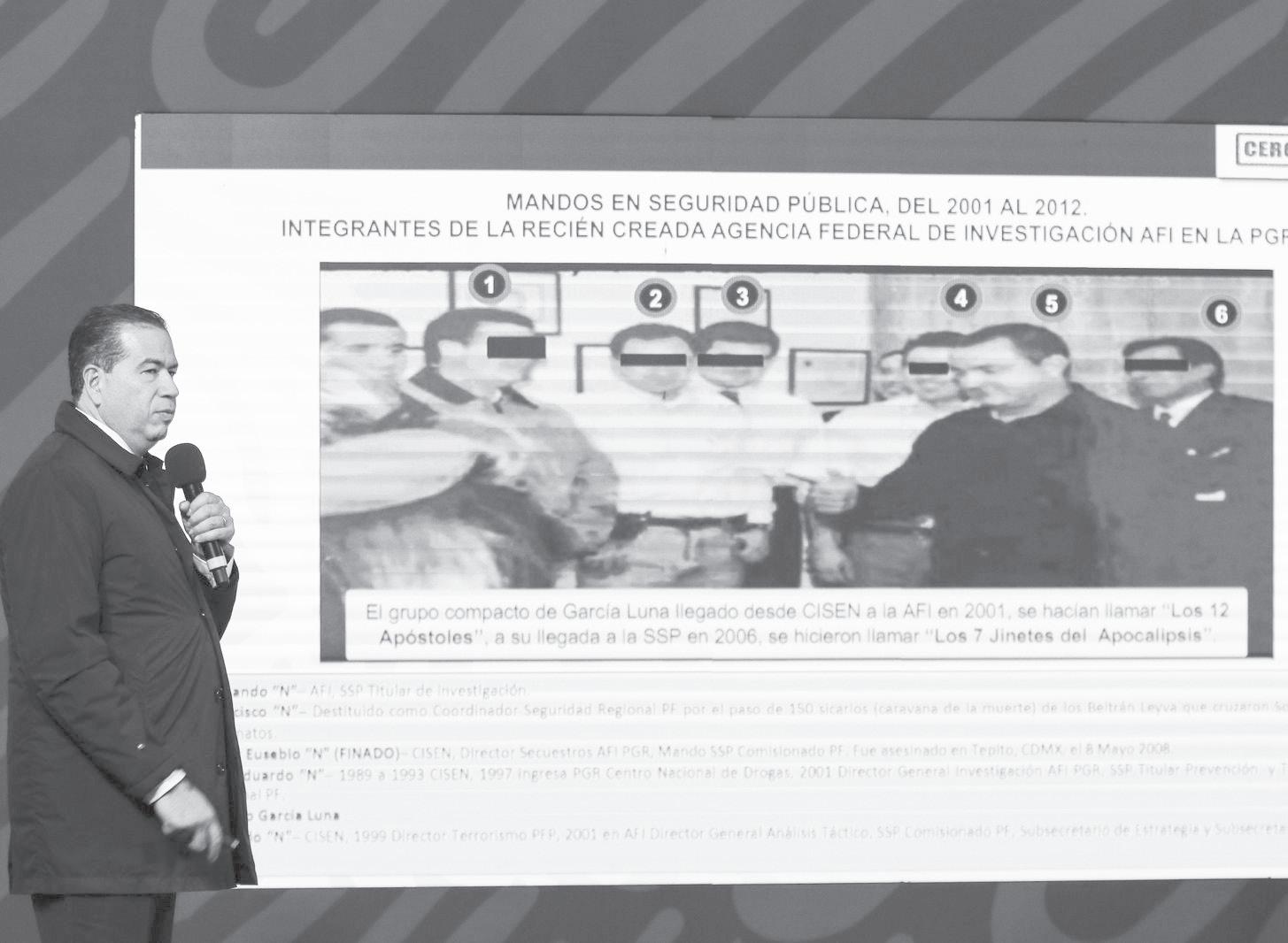 El subsecretario de Seguridad y Protección Ciudadana, Ricardo Mejía Berdeja, mostró la estructura criminal que operaba bajo el posible contubernio de Genaro García Luna, secretario de Seguridad Pública durante el gobierno de Felipe Calderón. Mostró una foto de la entonces recién creada Agencia Federal de Investigación, donde había un grupo compacto que venía del Centro de Investigación y Seguridad Nacional (Cisen), que se autodenominó ‘Los 12 Apóstoles’, en 2001, que para 2006 llegaron a la Secretaría de Seguridad Pública federal, encabezada por Genaro García Luna y se hacen llamar ‘Los Siete Jinetes del Apocalipsis’.