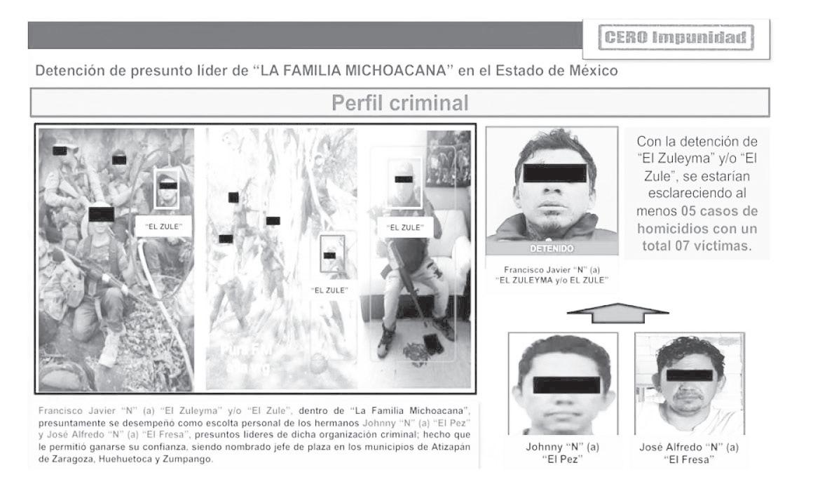 sunto líder de La Familia Michoacana en Atizapán, Huehuetoca y Zumpango en Estado de México. Fue capturado con un presunto sicario de nombre Joel N., alias El Tío, a quienes les decomisaron armas, cartuchos y drogas en esa entidad.