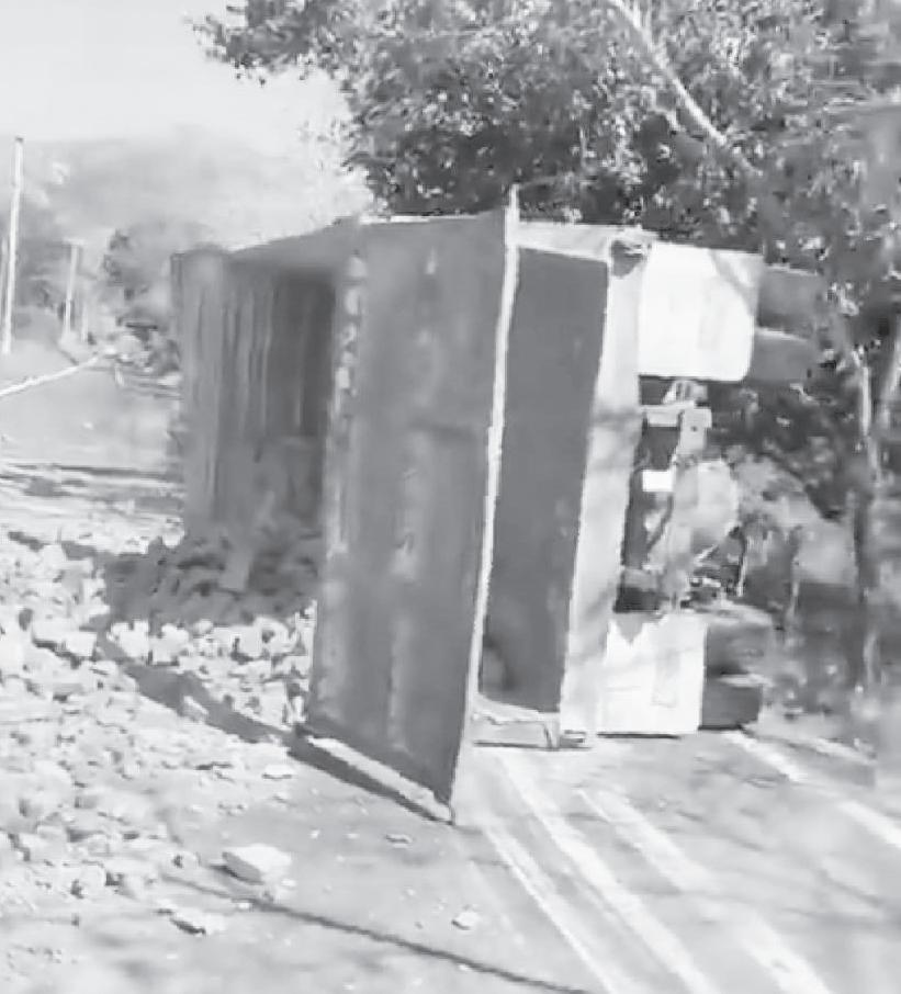 Un camión de volteo, color blanco, que transportaba tabique rojo, terminó volcando sobre la carretera Tlapa – San Luis Acatlán, a la altura de la colonia Rivera Acatlán.