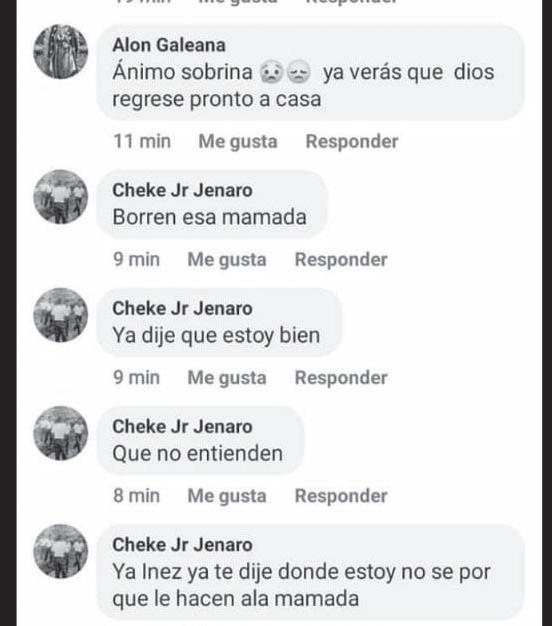 Cabe mencionar que el propio joven, mediante su cuenta de Facebook “Cheke Jr Jenaro”, comentó una publicación que hizo una familiar respecto a su desaparición, comentario del cual se respeta redacción: