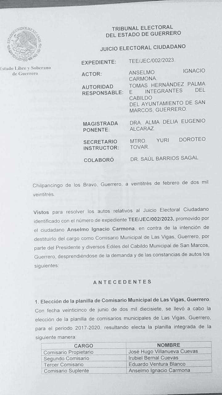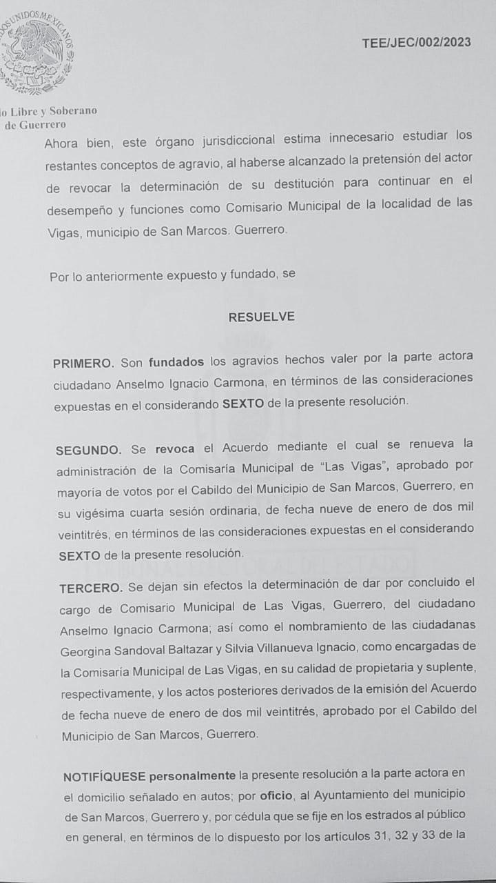 TEE revoca acuerdo de remoción del comisario de Las Vigas