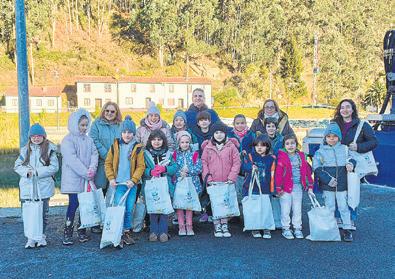 Escolares de Caravia con sus profesoras y el gerente del Leader Oriente, Germán Romano, en el puerto de Bustio.