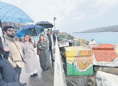 La visita comenzó por el puerto llanisco, donde están los Cubos de la Memoria, cuya primera fase, la que pintó Ibarrola en 2001, se va a restaurar ahora con cargo al PSTD. Si todo se desarrolla con normalidad, los Cubos estarán de nuevo como los dejó Ibarrola en el primer trimestre de 2026.