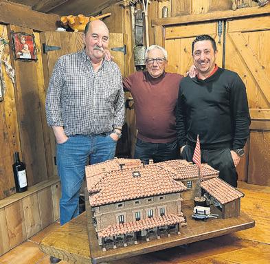 La Roca, de corcho Carlos Llerandi vecino de Cúa (Piloña) donde allí dedicó más de 600 horas para replicar, en corcho y a escala 1:75, la parrilla restaurante La Roca de Sevares. Fue Iker, el nieto de Pedro Sánchez, fundador del establecimiento, quien le pidió a Carlos que hiciese la réplica, que ya se puede ver en el establecimiento hostelero, tras recogerla el pasado fin de semana Pedro y su hijo Rubén, la segunda generación que está ya al frente de la emblemática parrilla. En la foto: Carlos, Pedro y Rubén con la réplica de La Roca.