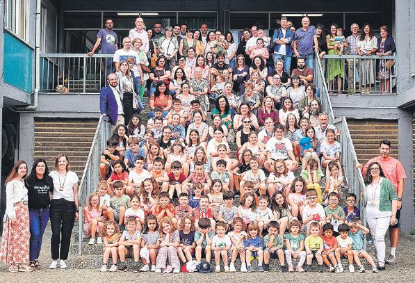 Foto de familia de escolinos, familiares, maestros y autoridades en el C.P. El Plaganón de Sevares.