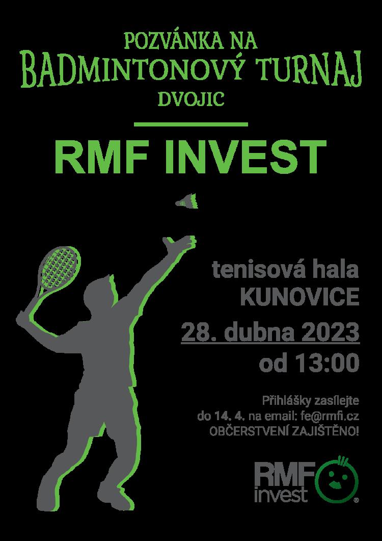 Vtomtočíslebychbylvelmirád,abyste nepřehlédlipozvánkunaBadmintonovýturnaj dvojicRMFInvest,kterýseodehrajevhalev Kunovicíchkoncemdubna.Prosímvšechny, kdosichcetejítzasportovat,oregistracico nejdříve.