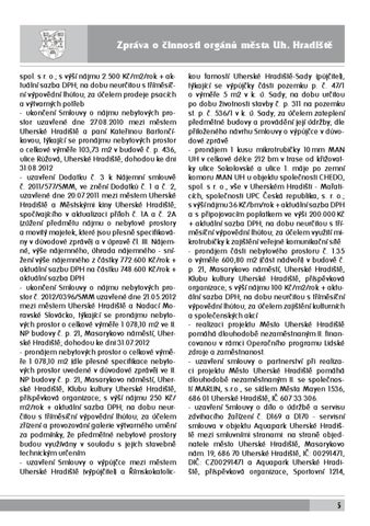 ětšidarH .hU atsěmZpráva ůnágrooitčinnosti sonnič oorgánů avárpZměsta Uh. Hradiště spol. s r. o.; s výší nájmu 2.500 Kč/m2/rok + aktuální sazba DPH; na dobu neurčitou s tříměsíční výpovědní lhůtou; za účelem prodeje psacích a výtvarných potřeb - ukončení Smlouvy o nájmu nebytových prostor uzavřené dne 27.08.2010 mezi městem Uherské Hradiště a paní Kateřinou Bartončíkovou, týkající se pronájmu nebytových prostor o celkové výměře 103,73 m2 v budově č. p. 436, ulice Růžová, Uherské Hradiště; dohodou ke dni 31.08.2012 - uzavření Dodatku č. 3 k Nájemní smlouvě č. 2011/577/SMM, ve znění Dodatků č. 1 a č. 2, uzavřené dne 20.07.2011 mezi městem Uherské Hradiště a Městskými kiny Uherské Hradiště; spočívajícího v aktualizaci příloh č. 1A a č. 2A (zúžení předmětu nájmu o nebytové prostory a movitý majetek, které jsou přesně specifikovány v důvodové zprávě) a v úpravě čl. III. Nájemné, výše nájemného, úhrada nájemného - snížení výše nájemného z částky 772.600 Kč/rok + aktuální sazbu DPH na částku 748.600 Kč/rok + aktuální sazba DPH - ukončení Smlouvy o nájmu nebytových prostor č. 2012/0396/SMM uzavřené dne 21.05.2012 mezi městem Uherské Hradiště a Nadací Moravské Slovácko, týkající se pronájmu nebytových prostor o celkové výměře 1 078,10 m2 ve II. NP budovy č. p. 21, Masarykovo náměstí, Uherské Hradiště; dohodou ke dni 31.07.2012 - pronájem nebytových prostor o celkové výměře 1 078,10 m2 (dle přesné specifikace nebytových prostor uvedené v důvodové zprávě) ve II. NP budovy č. p. 21, Masarykovo náměstí, Uherské Hradiště, Klubu kultury Uherské Hradiště, příspěvková organizace; s výší nájmu 250 Kč/ m2/rok + aktuální sazba DPH; na dobu neurčitou s tříměsíční výpovědní lhůtou; za účelem zřízení a provozování galerie výtvarného umění za podmínky, že předmětné nebytové prostory budou využívány v souladu s jejich stavebně technickým určením - uzavření Smlouvy o výpůjčce mezi městem Uherské Hradiště (výpůjčitel) a Římskokatolic-