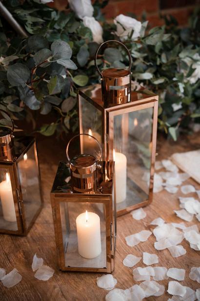 8 deluxe aisle lanterns in a choice of silver, copper, grey or vintage cream with pillar candles