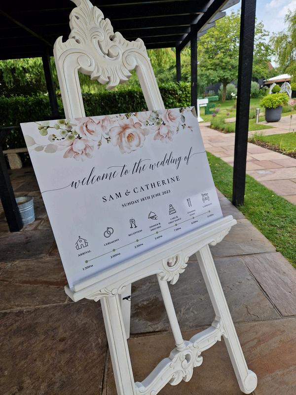 Complete your wedding with our beautiful personalised signage collection We design print and deliver a wide variety of personalised signage, including table plans, welcome signs and order of the day. Options include hire of vintage or rustic easels and silk flowers to fit in with your colour scheme.