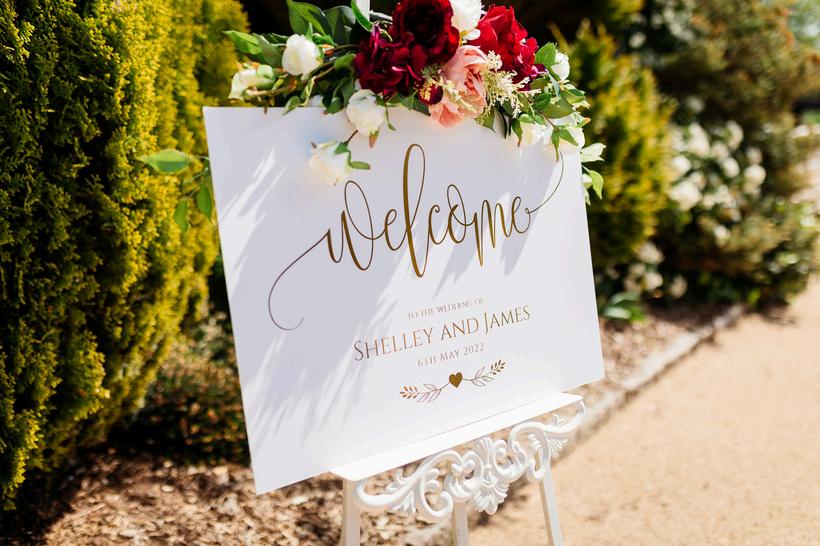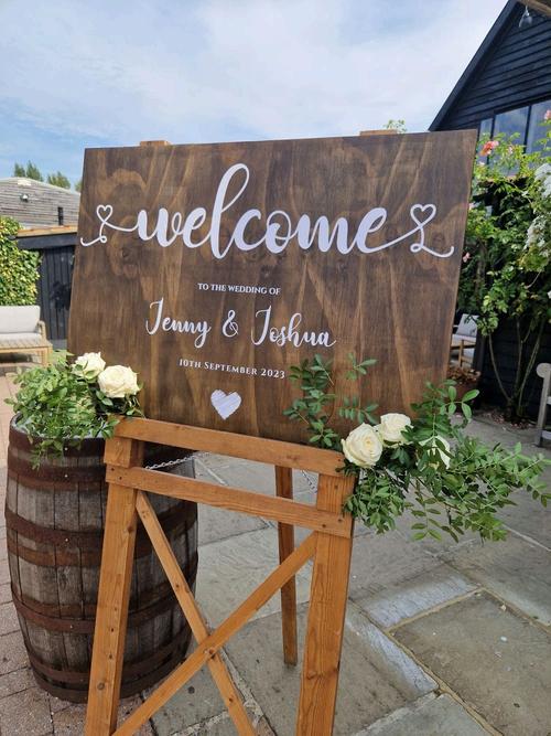 Personalised welcome board (which you get as a keepsake) on white wood easel with silk flower garland