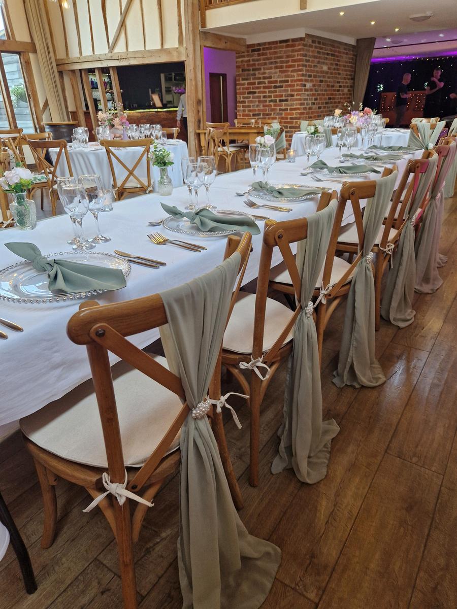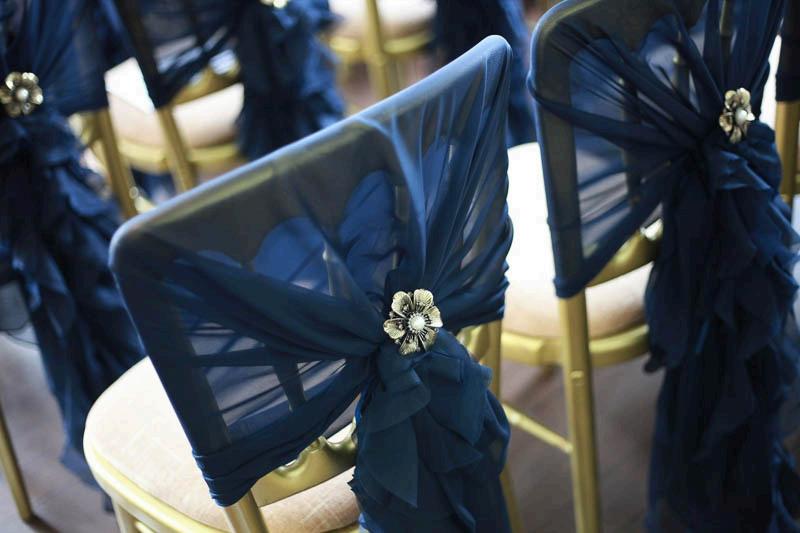 Deluxe chiffon chair drape or hood in colour of your choice with brooch or silk flower matching colour polyester napkin gold or silver beaded charger plate