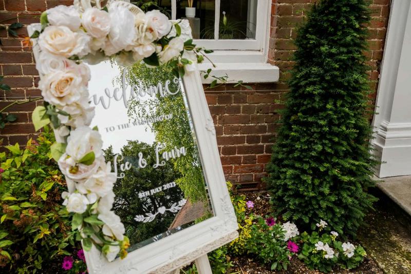 1 x personalised welcome mirror or board on white wood easel with silk flower garland