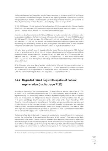 8.2.2 Degraded raised bogs still capable of natural regeneration (habitat type 7120) According to the results of the inventory there are 176 bogs in Estonia, with the total surface of 7,753 ha, which can be qualified as Natura habitat type 7120 (degraded raised bogs still capable of natural regeneration) (Fig. 22). Additionally, there are numerous degraded marginal parts of at least 66 unspoiled bogs, but in calculations and data processing they are considered as minority habitats under the type 7110 (active raised bogs). Still, the calculation of the total surface of the Natura habitat type 7120 should be more or less exhaustive since all areas of this habitat type are covered by mire vegetation and included, therefore, in the inventory. In practice, some totally degraded mire areas were not marked as subjects to visit if their low quality was evident already from orthophotos or from other sources; these areas might also include some habitats qualifying as type 7120. All in all, it could be estimated that the area of habitats of this type is some 10,000 hectares in Estonia. The Estonian official data for the Article 17 assessment, provided by the Estonian Ministry of the Environment, estimate the total surface of degraded bogs in Estonia at 56,500 hectares66. This seems to be highly overestimated. In the present Estonian conditions, degraded raised bogs tend to be covered by higher pines especially if Sphagnum layer becomes decomposed, and do not correspond to the type 7120 any more. They could rather be interpreted as type 91D0 of poor quality and many of them, after intensive decomposition of upper peat layer do not correspond to any Natura habitat type at all. The majority of abandoned peat-fields