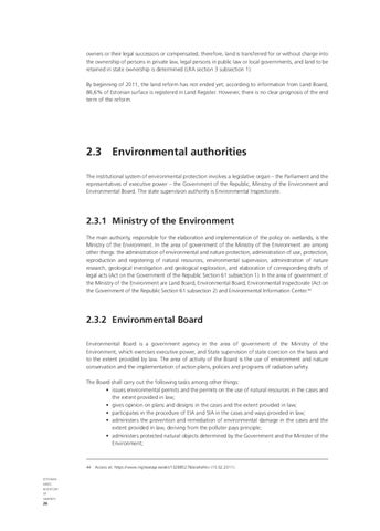 2.3.1 Ministry of the Environment The main authority, responsible for the elaboration and implementation of the policy on wetlands, is the Ministry of the Environment. In the area of government of the Ministry of the Environment are among other things: the administration of environmental and nature protection, administration of use, protection, reproduction and registering of natural resources, environmental supervision, administration of nature research, geological investigation and geological exploration, and elaboration of corresponding drafts of legal acts (Act on the Government of the Republic Section 61 subsection 1). In the area of government of the Ministry of the Environment are Land Board, Environmental Board, Environmental Inspectorate (Act on the Government of the Republic Section 61 subsection 2) and Environmental Information Center.44