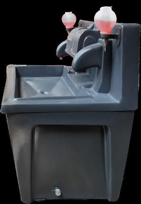 Azul Naranja Verde Limón especificaciones Material de Fibra de Vidrio. 02 Caños 01 Dispensador de Papel Toalla 02 Dispensador de Jabón Líquido 02 Bombas de Pie (Tipo Diafragma) Capacidad Estanque: 202.5 L agua fresca. 202.5 L agua residual.