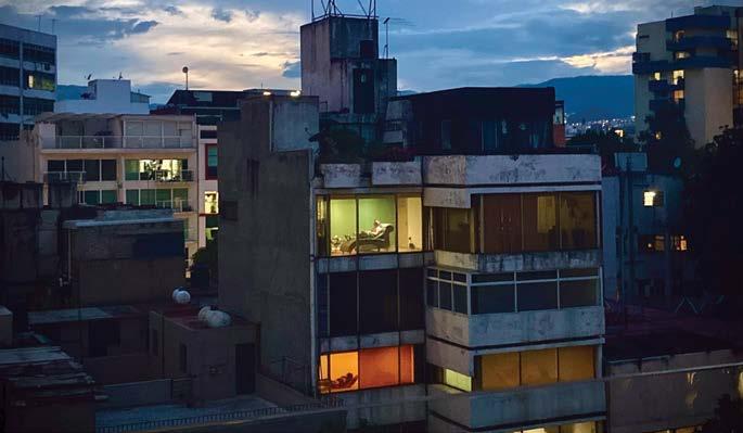 Escena cotidiana en un edificio donde hay consultorios de salud mental, en la colonia Extremadura Insurgentes de la CDMX. La imagen está inspirada en la obra del pintor modernista Edward Hopper, quien retrataba la soledad en la vida estadounidense. Foto: Federico Gama.