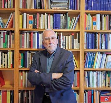 Mateo Díez frente a su biblioteca, en su casa de Madrid.