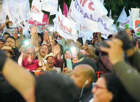Con batucada, arlequines y las canciones propias de la campaña de Brugada, los simpatizantes hicieron suyo el espacio de la calle principal, cerrado y resguardado por elementos de seguridad para salvaguardar la integridad de los candidatos. Clara, escucha, estamos en tu lucha y Contra el Cártel, fuerte, Clara está presente, fueron las consignas más sonadas.