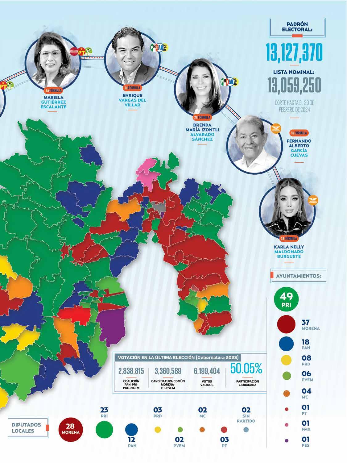 En las elecciones estatales, en 2023, donde resultó electa Delfina Gómez, primera gobernadora de la entidad y que arrancó al PRI ese importante bastión, la coalición que la representó (Morena-PT-PVEM) obtuvo 3 millones 360 mil 589 votos, contra 2 millones 838 mil 815 votos de la alianza PAN-PRIPRD-NAEM.