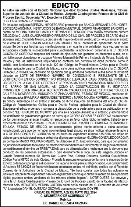 Diario El Heraldo de México. Editor responsable: Alfredo González Castro. Número de Certificado de Reserva otorgado por el Instituto Nacional del Derecho de Autor 04-2009060419022100-101. Número de Certificado de Licitud de título y Contenido No.16921. Domicilio de la Publicación: Paseo de la Reforma No. 250, Piso 24, Colonia Juárez, Del. Cuauhtémoc, C.P. 06600, Ciudad de México. Impreso en Talleres de La Crónica Diaria , S.A. de C. V. Calzada Azcapotzalco La Villa No. 160 Barrio San Marcos Alcaldia Azcapotzalco, CP 02020 Publicación Diaria. Todos los derechos están reservados. Queda estrictamente prohibida la reproducción total o parcial de los contenidos e imágenes de esta publicación sin previa autorización de El Heraldo de México. El contenido de los artículos es responsabilidad exclusiva de los autores.