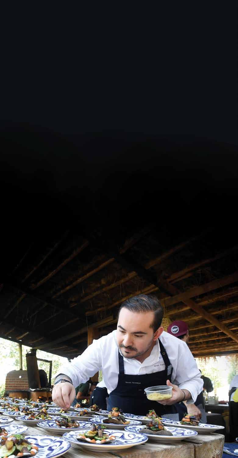 La destreza culinaria de Israel Arétxiga es indiscutible, reflejándose en cada exquisito platillo que sale de su cocina. Con una técnica impecable y un profundo respeto por las raíces vascas, el chef preparó espectaculares platillos utilizando ingredientes de la red Arca Tierra; así como su chinampa, fusionando lo tradicional con lo innovador. Y a diferencia de su cocina habitual en Zeru Lomas, donde cuentan con gas y electricidad, el equipo de Arétxiga se enfrentó al desafío de cocinar en una cocina de humo, empleando únicamente leña, todo al aire libre. Esta experiencia les obligó a adaptarse a un ambiente nuevo y a redescubrir la esencia de la cocina tradicional. Un aspecto que sin duda enri-
