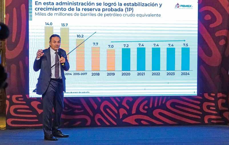› Los datos que entrega el director de Petróleos Mexicanos, Octavio Romero, a la próxima administración indican que se frenó la caída en la producción, además de que la reserva se incrementó a 7 mil 500 millones de barriles de crudo. Asimismo, la información arroja que la refinación creció más del doble: de 511 mil barriles al día, en 2018 a un millón 198 mil al cierre de junio pasado. Incluso deja constancia de que la deuda se redujo en 25%, lo que equivale a 33 mil millones de dólares.