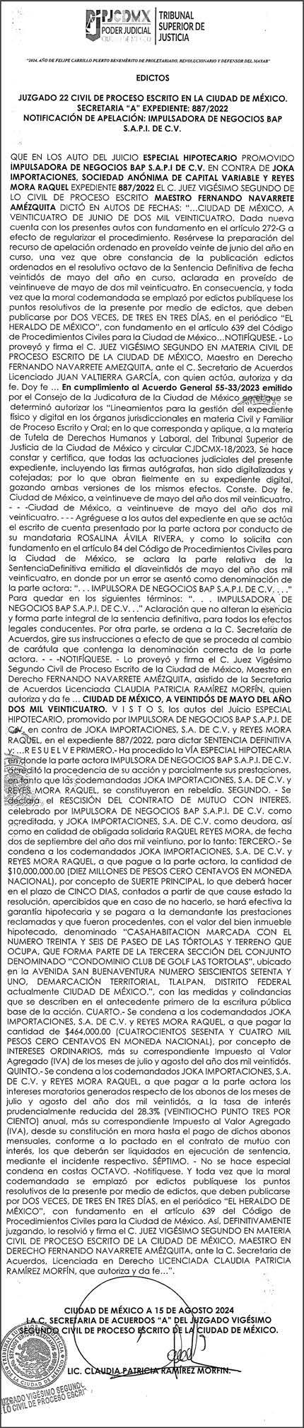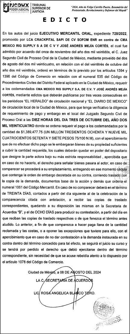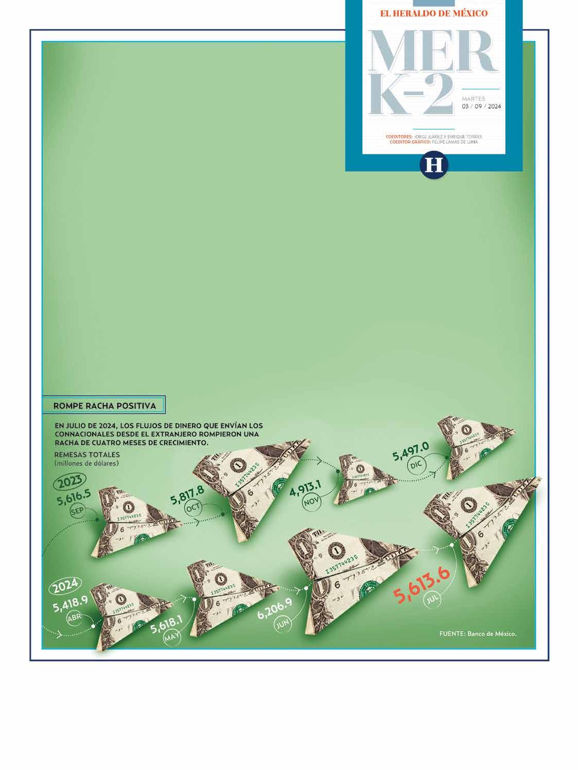 Periódico El Heraldo de México. Editor Responsable: Alfredo González Castro, Número de Certificado de Reserva otorgado por el Instituto Nacional del Derecho de Autor: 04-2009-060419022100-101. Número de Certificado de Licitud de Título y Contenido: 16921. Domicilio de la Publicación: Av. Insurgentes Sur, No. 1271, piso 2, oficina 202, Extremadura Insurgentes, Benito Juárez, C.P. 03740. Impreso en LA CRÓNICA DIARIA, SA DE CV, Avenida Azcapotzalco La Villa 160, Colonia San Marcos, Alcaldía Azcapotzalco, Ciudad de México, CP 02020. Distribuidores: ARREDONDO E HIJOS DISTRIBUIDORA, SA de CV, Iturbide 18 local D, Colonia Centro de la Ciudad de México Área 4, Alcaldía Cuauhtémoc, Ciudad de México, CP 06040. ELIZABETH IVONNE GUTIÉRREZ ORTIZ, Callejón 2o de la Luz 52, Departamento 4, Interior 1, Colonia Anáhuac II Sección, Alcaldía Miguel Hidalgo, Ciudad de México, CP 11320. AEROVÍAS EMPRESA DE CARGO, SA de CV, Paseo de la Reforma 445, Piso 9, Colonia Cuauhtémoc, alcaldía Cuauhtémoc, Ciudad de México, CP 06000 Publicación Diaria No. 2638, 3 de septiembre de 2024.