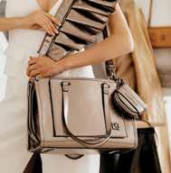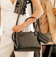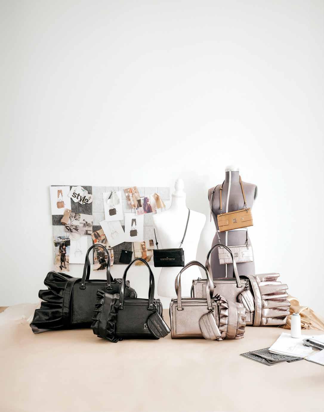 La línea está conformada por una billetera crossbody, con una silueta tríptica y dos bolsos de asas largas enmarcadas por la silueta de un olán.