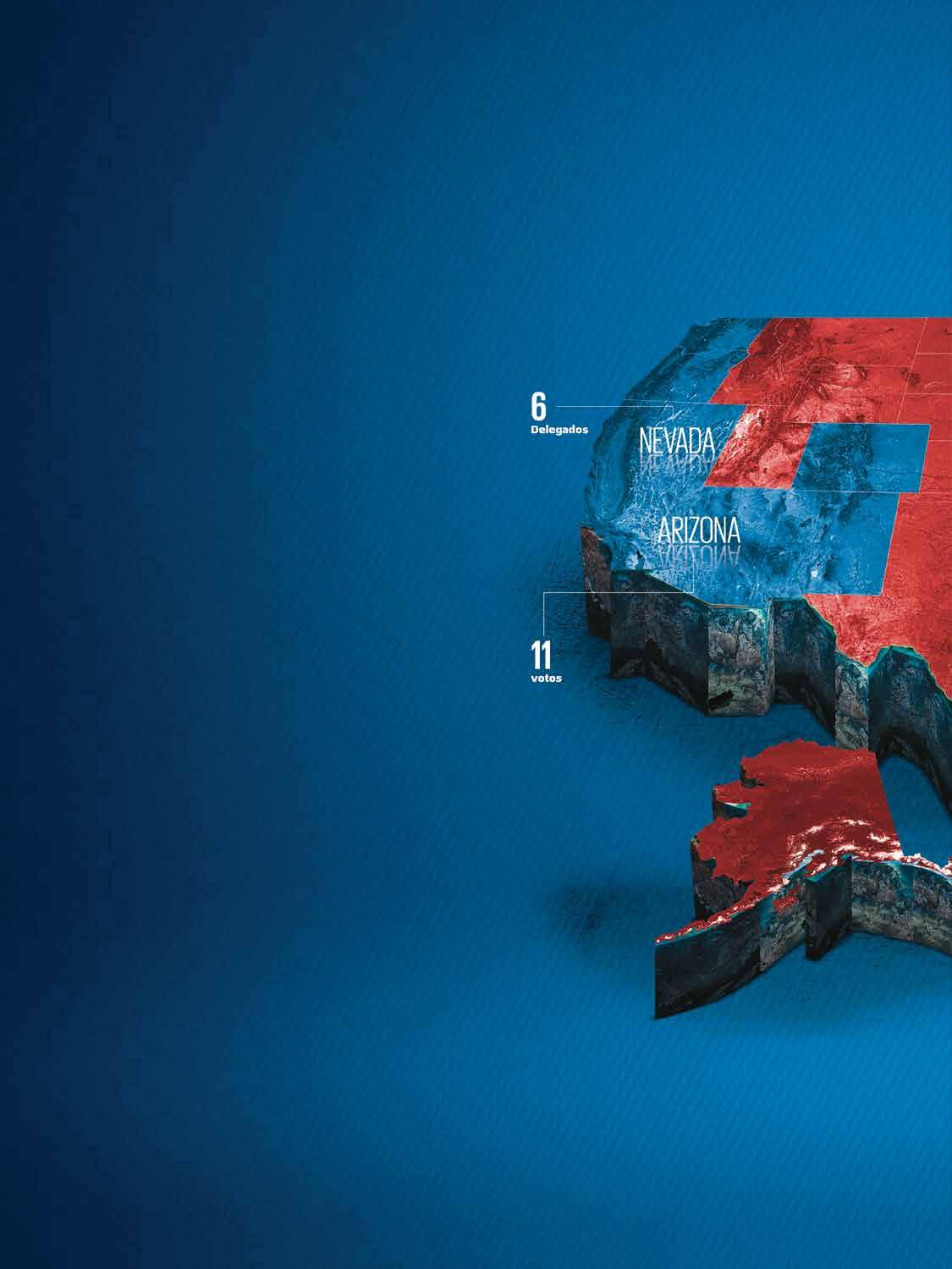 • Nevada da 6 votos electorales. Hay 450,000 habitantes latinos, de los cuales 71.2% son de origen mexicano. Pueden votar 280,000. Biden ganó en 2024 por 34,000 votos.