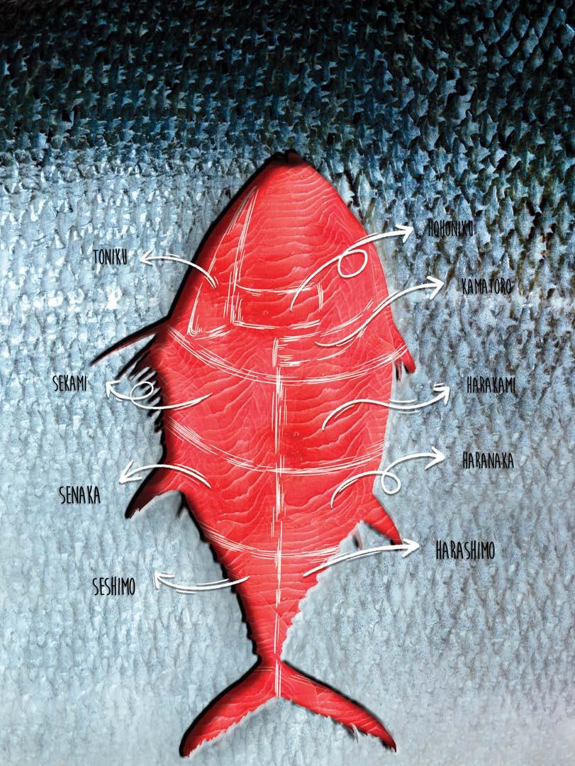 Para muchos, la joya de la corona es el kamatoro, la zona con más grasa intramuscular de todo el atún, de la cual se obtienen sólo dos pequeñas piezas del área situada entre la zona branquial y el vientre del atún.