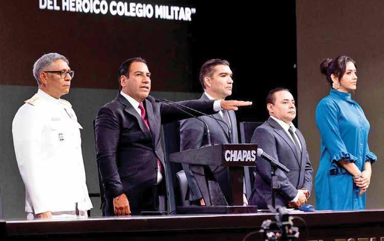 › Acompañado por la plana mayor de Morena, mandatarios de diferentes entidades del país y ministros de la Corte, Eduardo Ramírez Aguilar rindió protesta como nuevo gobernador de Chiapas. En su discurso de posesión dijo que llega puntual a la cita con su destino y aseguró: ¡Chiapanecas y chiapanecos, no les voy a fallar!