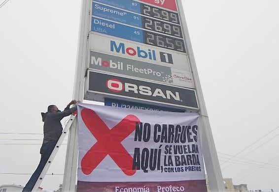 › Cumplió su advertencia el titular de la Profeco, Iván Escalante, de exhibir públicamente a gasolinerías que vendan caro el combustible. Ayer colgaron lonas con la leyenda “No cargues aquí, se vuelan la barda con los precios” en tres establecimientos en Monterrey, Durango y León. Se colocarán en todos los que vendan arriba de $24 el litro.
