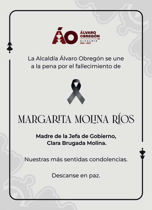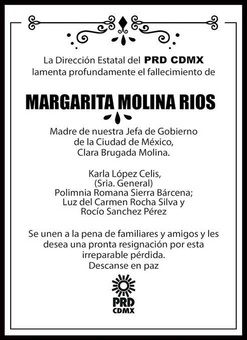 › Todo el cariño y apoyo recibió la jefa de Gobierno de la CDMX, Clara Brugada Molina tras darse a conocer la muerte de su madre, la señora Margarita Molina Ríos Desde el gobierno federal hasta el Congreso capitalino le enviaron un abrazo por esta irreparable pérdida. Incluso iztapalapenses, donde fue alcaldesa, se mostraron solidarios.