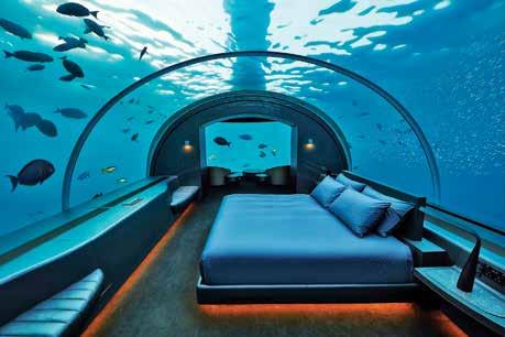 The Muraka, la exuberante residencia de dos plantas –una sobre el agua y, la otra, sumergida cinco metros bajo la superficie– en el hotel Conrad Maldives Rangali Island, ubicado en el corazón del océano Índico, presume una habitación envuelta en un domo de acrílico.