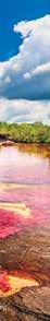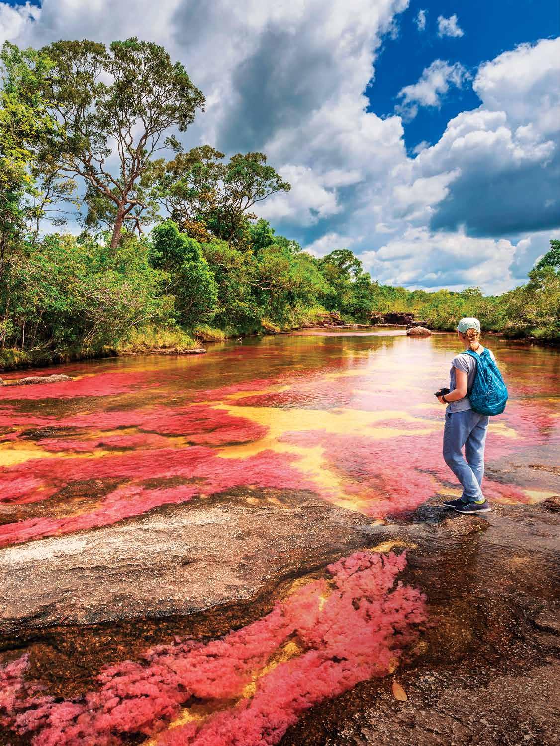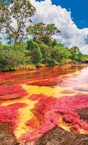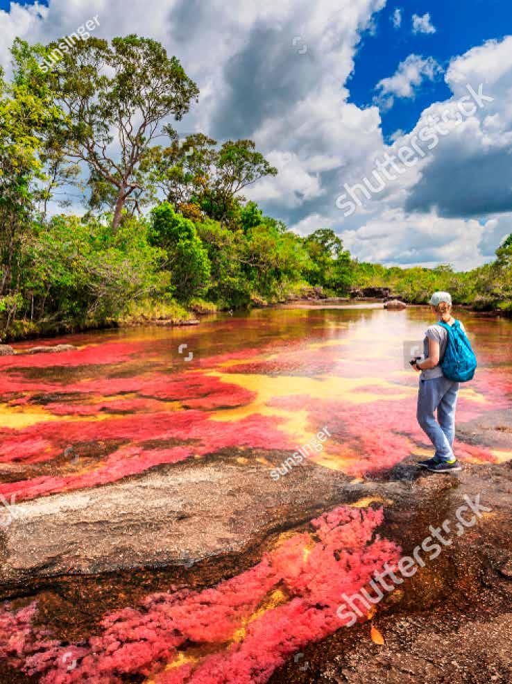 También conocido como el “Río de los Cinco Colores”, Caño Cristales es un afluente en el municipio colombiano de La Macarena que presenta una variedad de colores vibrantes, que incluyen morado, rojo, rosa, verde y amarillo, provocados por la macarenia clavigera, una planta acuática que crece en el lecho del río.