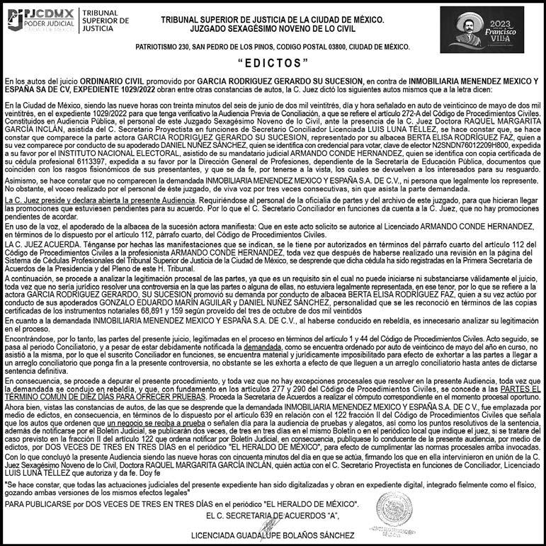 Editor responsable: Alfredo González Castro. Número de Certificado de Reserva otorgado por el Instituto Nacional del Derecho de Autor 04-2009060419022100-101. Número de Certificado de Licitud de título y Contenido No.16921. Domicilio de la Publicación: Paseo de la Reforma No. 250, Piso 24, Colonia Juárez, Del. Cuauhtémoc, C.P. 06600, Ciudad de México. Impreso en Talleres de La Crónica Diaria S.A. de C. V. Calzada Azcapotzalco La Villa No. 160 Barrio San Marcos Alcaldia Azcapotzalco, CP 02020 Publicación Diaria. Todos los derechos están reservados. Queda estrictamente prohibida la reproducción total o parcial de los contenidos e imágenes de esta publicación sin previa autorización de El Heraldo de México. El contenido de los artículos es responsabilidad exclusiva de los autores.