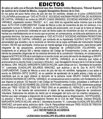 Diario El Heraldo de México. Editor responsable: Alfredo González Castro. Número de Certificado de Reserva otorgado por el Instituto Nacional del Derecho de Autor 04-2009-060419022100-101. Número de Certificado de Licitud de título y Contenido No.16921. Domicilio de la Publicación: Paseo de la Reforma No. 250, Piso 24, Colonia Juárez, Del. Cuauhtémoc, C.P. 06600, Ciudad de México. Imprenta: Impreso en Talleres de La Crónica Diaria , S.A. de C. V. Calzada Azcapotzalco La Villa No. 160 , Barrio San Marcos Alcaldia Azcapotzalco, CP 02020. Publicación Diaria. Todos los derechos están reservados. Queda estrictamente prohibida la reproducción total o parcial de los contenidos e imágenes de esta publicación sin previa autorización de El Heraldo de México. El contenido de los artículos es responsabilidad exclusiva de los autores.