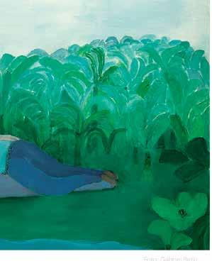 Inspirada en una fotografía de Diane Arbus, su pintura La danza del venado es la potente presentación de una mujer de brazos extendidos ante un fondo dividido que podría ser una capa. Su desnudez no la hace vulnerable, enfrenta al espectador con la compañía de seres vegetales que rompen el vacío.