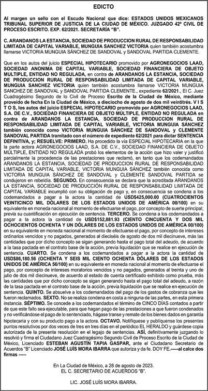 Diario El Heraldo de México. Editor responsable: Alfredo González Castro. Número de Certificado de Reserva otorgado por el Instituto Nacional del Derecho de Autor 04-2009-060419022100-101. Número de Certificado de Licitud de título y Contenido No.16921. Domicilio de la Publicación: Paseo de la Reforma No. 250, Piso 24, Colonia Juárez, Del. Cuauhtémoc, C.P. 06600, Ciudad de México. Imprenta: Impreso en Talleres de La Crónica Diaria , S.A. de C. V. Calzada Azcapotzalco La Villa No. 160 , Barrio San Marcos Alcaldia Azcapotzalco, CP 02020. Publicación Diaria. Todos los derechos están reservados. Queda estrictamente prohibida la reproducción total o parcial de los contenidos e imágenes de esta publicación sin previa autorización de El Heraldo de México. El contenido de los artículos es responsabilidad exclusiva de los autores.