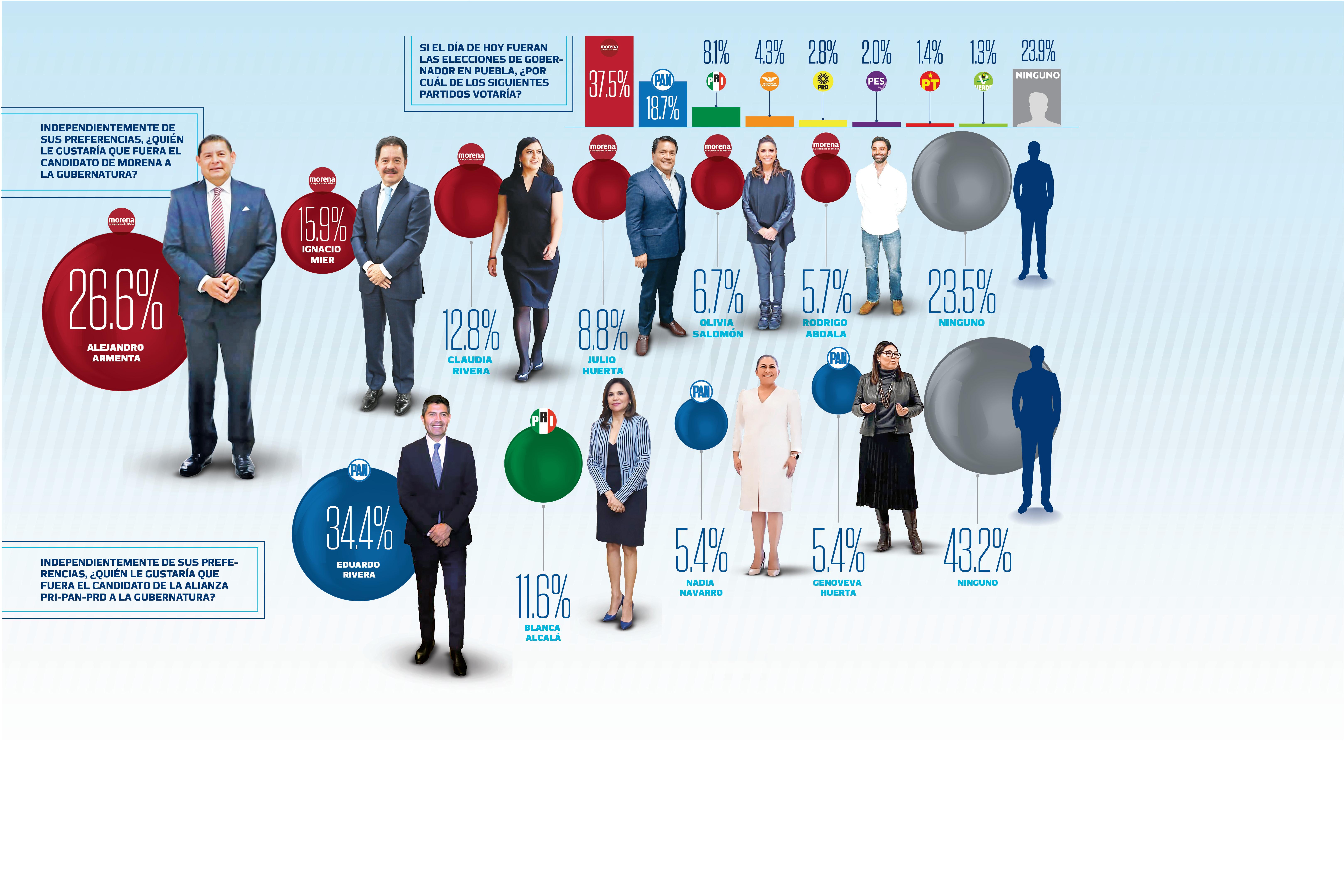 Si hoy fueran las elecciones para renovar la gubernatura de Puebla, Morena ganaría con 37.5 por ciento de los votos, una ventaja de dos a uno, ya que el PAN obtendría 18.7 por ciento, de acuerdo con la encuesta de El Heraldo de México/Poligrama. Después, se encuentra el PRI con 8.1 por ciento en las preferencias, seguido de Movimiento Ciudadano con 4.3 por ciento, PRD con 2.8 por ciento y PES con 2 por ciento. En tanto, 1.4 por ciento dijo que votaría por el PT y 1.3 por ciento por el PVEM, mientras que 23.9 por ciento no votaría por ninguno. A la pregunta de ¿quién le gustaría que fuera el candidato de Morena a