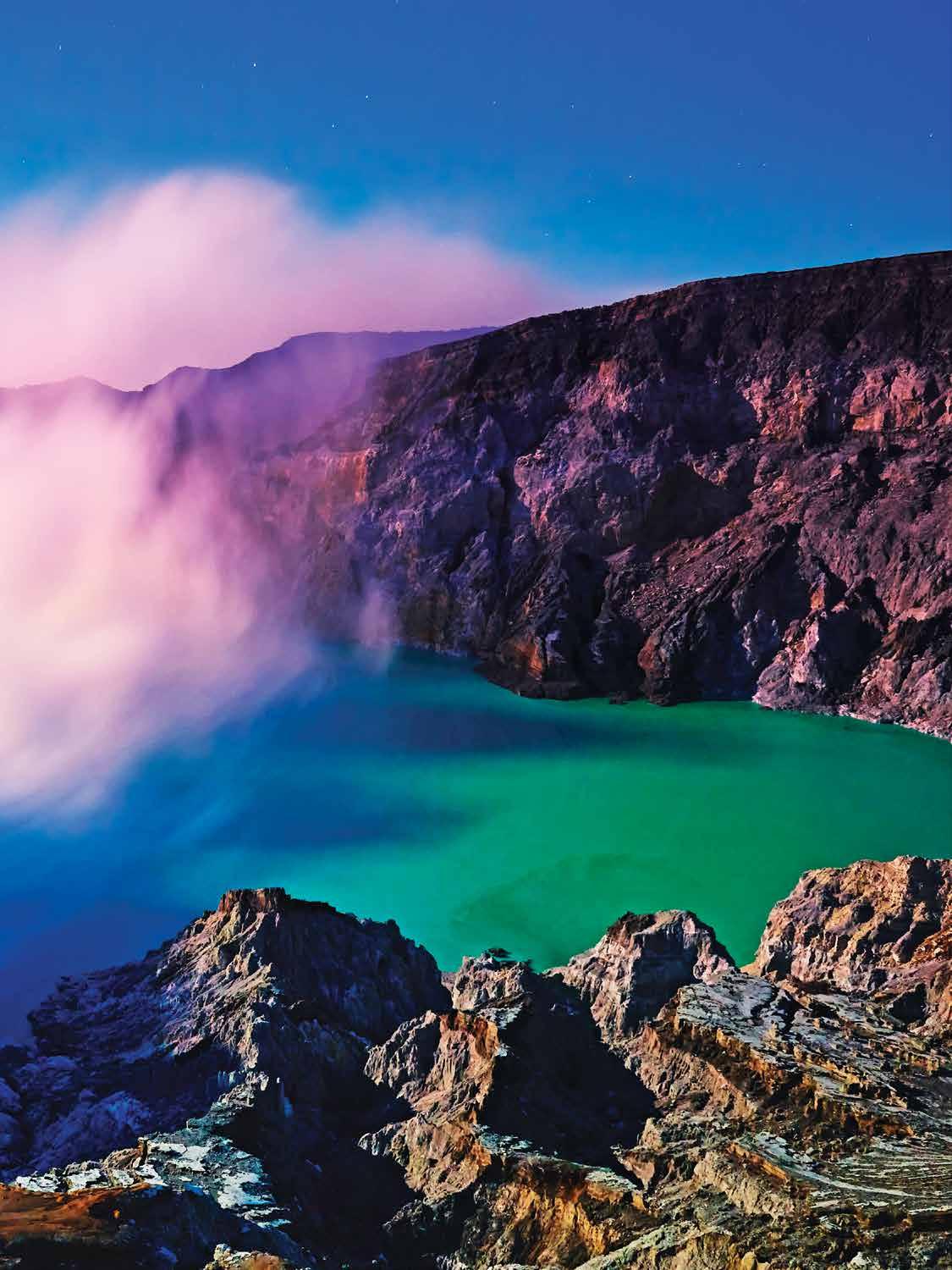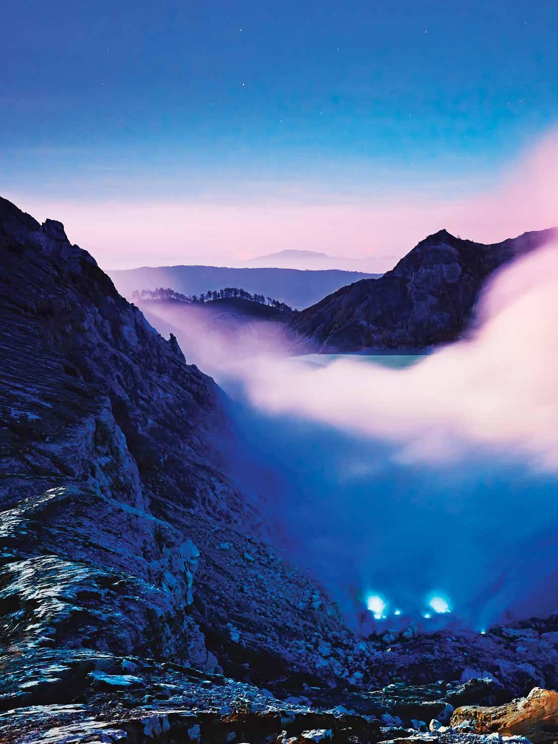 Viajar a un volcán activo es una aventura reservada para los viajeros más arriesgados, pero en este caso, la recompensa, sin duda, lo justifica: al caer la noche, el cráter Kawah Ijen, en el este de Java, Indonesia, resplandece bajo el llamativo fulgor azul eléctrico causado por la combustión de gases sulfúricos emitidos por el volcán.
