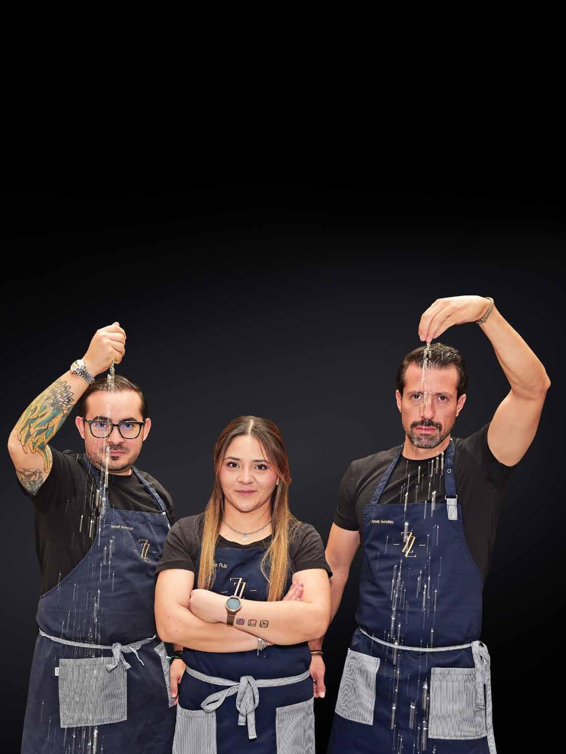 l LOS CHEFS. Alfredo González de Antifine, con Mariana Ruiz, jefa de cocina de Zeru Lomas e Israel Arétxiga, chef ejecutivo de Grupo Zeru.