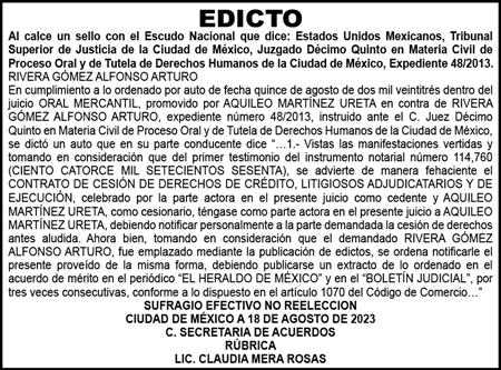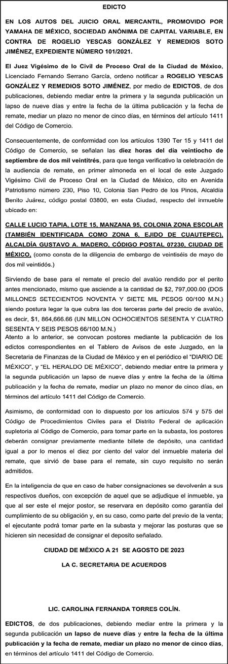Diario El Heraldo de México. Editor responsable: Alfredo González Castro. Número de Certificado de Reserva otorgado por el Instituto Nacional del Derecho de Autor 04-2009-060419022100-101. Número de Certificado de Licitud de título y Contenido No.16921. Domicilio de la Publicación: Paseo de la Reforma No. 250, Piso 24, Colonia Juárez, Del. Cuauhtémoc, C.P. 06600, Ciudad de México. Imprenta: Impreso en Talleres de La Crónica Diaria , S.A. de C. V. Calzada Azcapotzalco La Villa No. 160 , Barrio San Marcos Alcaldia Azcapotzalco, CP 02020. Publicación Diaria. Todos los derechos están reservados. Queda estrictamente prohibida la reproducción total o parcial de los contenidos e imágenes de esta publicación sin previa autorización de El Heraldo de México. El contenido de los artículos es responsabilidad exclusiva de los autores.