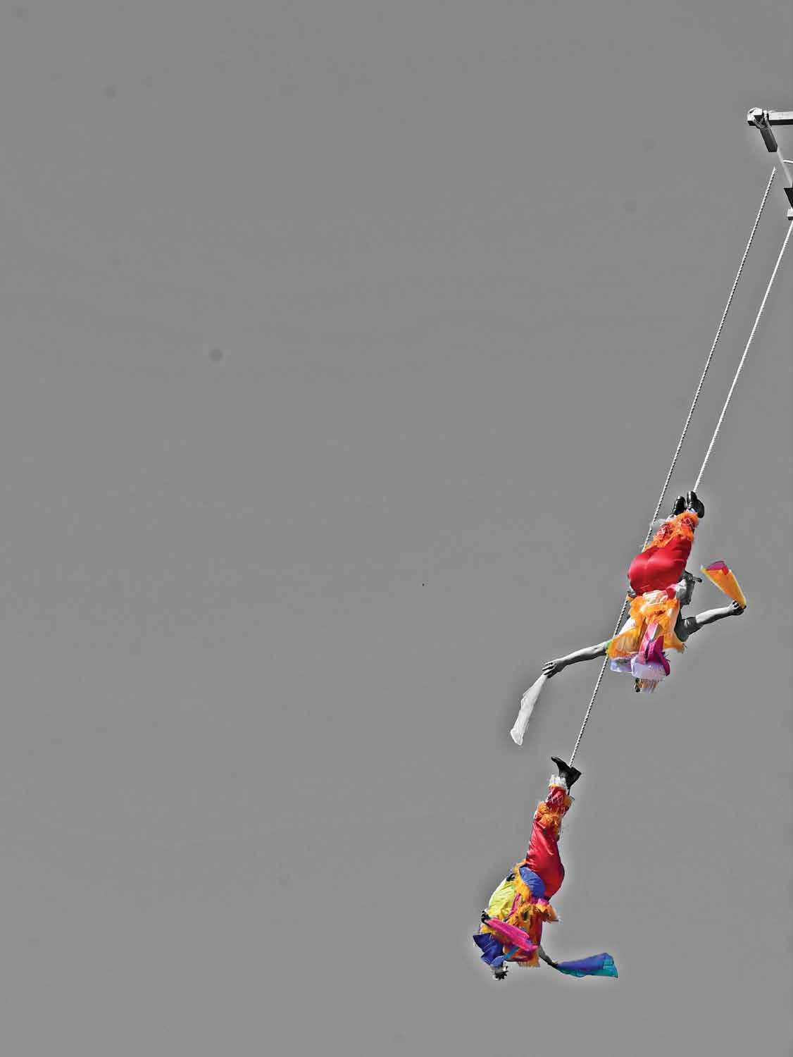 Jocelyn también tiene un hijo volador de siete años; ella tiene 26 y ha pasado 16 danzando. “Yo vuelo en mi comunidad cada vez que hay fiesta patronal o se celebra a algún santo, también en cada inicio de año; volamos para darle gracias a Dios por el Año Nuevo, para que nos traiga prosperidad, salud… pero en lo personal yo me encomiendo a mi familia, cuando voy a subir a volar ofrezco mi vuelo a cambio de que tengan salud los míos, a los que quiero”.